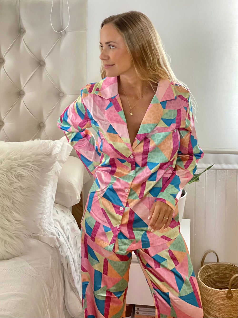 Otro nivel este pantalón de satén que es mas que un pijama y llego para quedarse con un increíble estampado animal print y lleno de colores vibrantes que te harán sentir llena de energía.