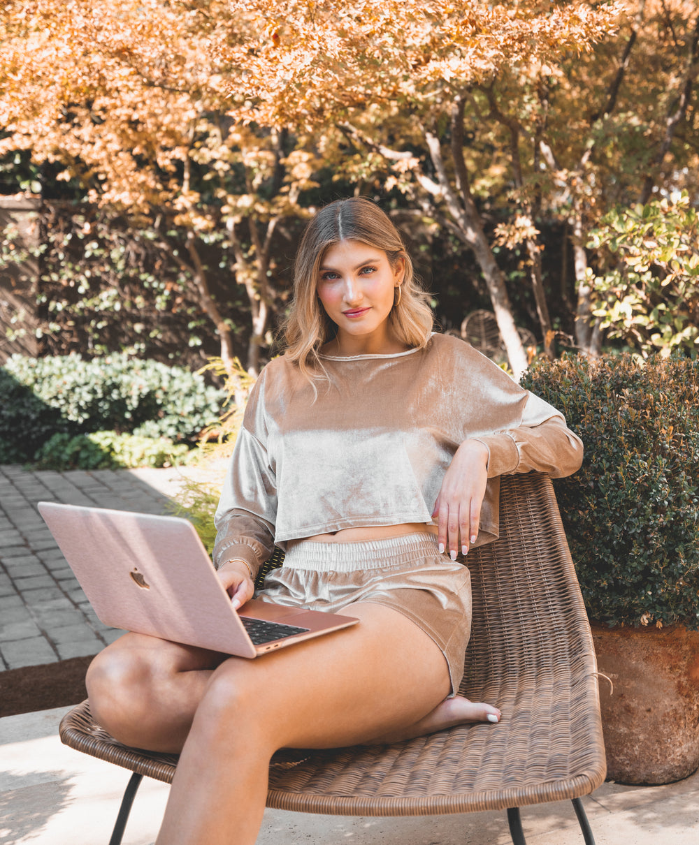 Pijama de terciopelo o velvet en color dorado, incluye un top de mangas largas, el top es corto, a su vez el short es de tiro alto con una pretina ancha sumamente cómoda.